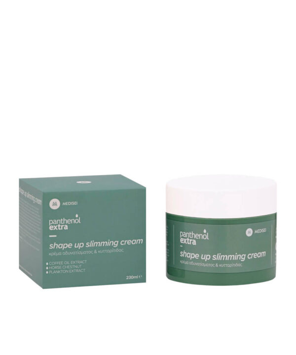 Συνεισφέρει σημαντικά στη μείωση πόντων στην περιοχή μηριών, γλουτών και κοιλιάς. Το καινοτόμο δραστικό θαλάσσιας προέλευσης που περιέχει, βοηθάει στην αναδιαμόρφωση της σιλουέτας, τόσο σε άντρες όσο και σε γυναίκες, μειώνοντας το πάχος του υποδόριου λιπώδους ιστού. Δρα κατά της κυτταρίτιδας, εξομαλύνει την τραχύτητα της επιδερμίδας και βελτιώνει την εμφάνιση του δέρματος. Σε συνδυασμό με το έλαιο καφέ και το εκχύλισμα ιπποκάστανου, βοηθάει στην ελαστικότητα της επιδερμίδας, με αποτέλεσμα τη σύσφιξη του δέρματος. Η Panthenol extra shape up slimming cream, είναι εμπλουτισμένη με βιταμίνη Ε, που βοηθάει στην κυτταρική ανανέωση.