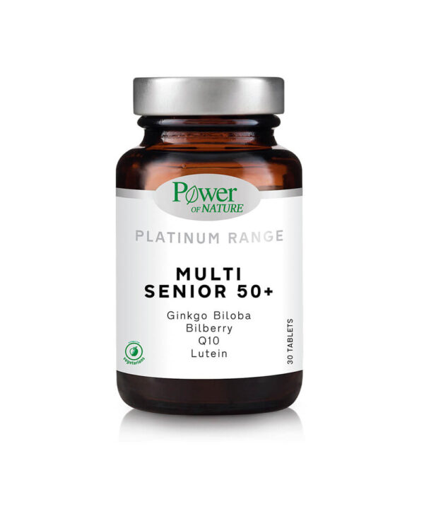 Η Power of Nature Platinum Range Multi Senior 50+ είναι ένα πολυβιταμινούχο συμπλήρωμα διατροφής, ειδικά σχεδιασμένο για να καλύψει τις ιδιαίτερες ανάγκες του οργανισμού των ενηλίκων 50+. Περιέχει βιταμίνες, μέταλλα και ιχνοστοιχεία, μαζί με ωφέλιμα φυτικά συστατικά, συνένζυμο Q10 και λουτεΐνη.