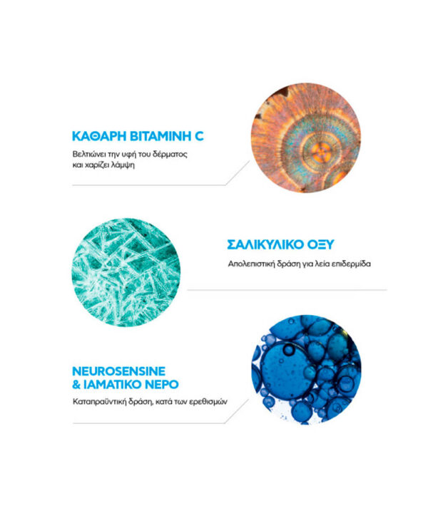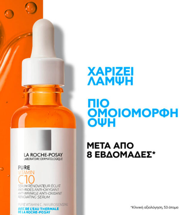 To PURE VITAMIN C10 serum της La Roche-Posay είναι ένας αντιοξειδωτικός, αντιρυτιδικός, αναζωογονητικός ορός λάμψης. Εμπλουτισμένος με 10% Βιταμίνη C, η οποία ενεργοποιεί την παραγωγή κολλαγόνου Μειώνει τη παραγωγή ελευθέρων ριζών Μειώνει ρυτίδες & λεπτές γραμμές Με Σαλικυλικό οξύ που απολεπίζει στην επιφάνεια και διευκολύνει την απομάκρυνση των νεκρών κυττάρων Ενισχυμένο με Neurosensine και Ιαματικό νερό La Roche-Posay που απομακρύνουν τον ερεθισμό και περιορίζουν τη νευρογενή αντίδραση του δέρματος
