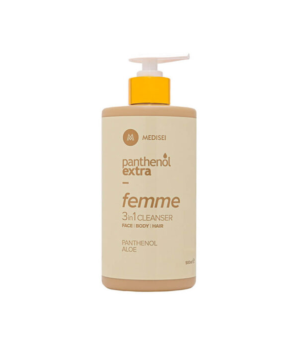 Το γυναικείο Panthenol Extra Femme 3in 1 Cleanser, καθαρίζει αποτελεσματικά πρόσωπο, σώμα και μαλλιά.
