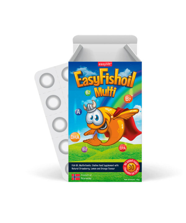 Το EasyVit EasyFishoil Multi + Choline είναι ένα συμπλήρωμα διατροφής για παιδιά, το οποίο περιέχει ιχθυέλαιο πλούσιο σε ωμέγα 3 λιπαρά οξέα, συνδυαστικά με βιταμίνες και χολίνη.